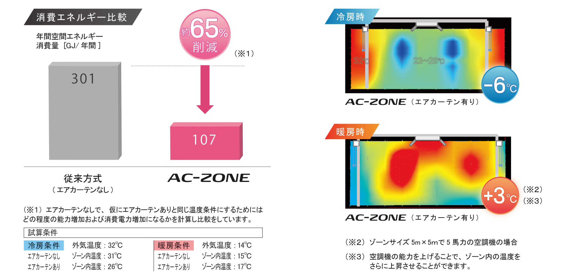 エアカーテンで空気の壁を作り、空調した冷気や暖気が外へ漏れることを防ぐことで、ゾーン内の温度を一定に保ちます。従来のように工場全体を空調する必要がなく、必要な場所だけ空調することができるため、空調のエネルギー消費量を約65%、大幅に削減が可能です。また、通常のエアーカーテンに比べて半分以下の風速なので、出入り時の不快感が少なく、作動音も30dB程度と作業中も快適です。