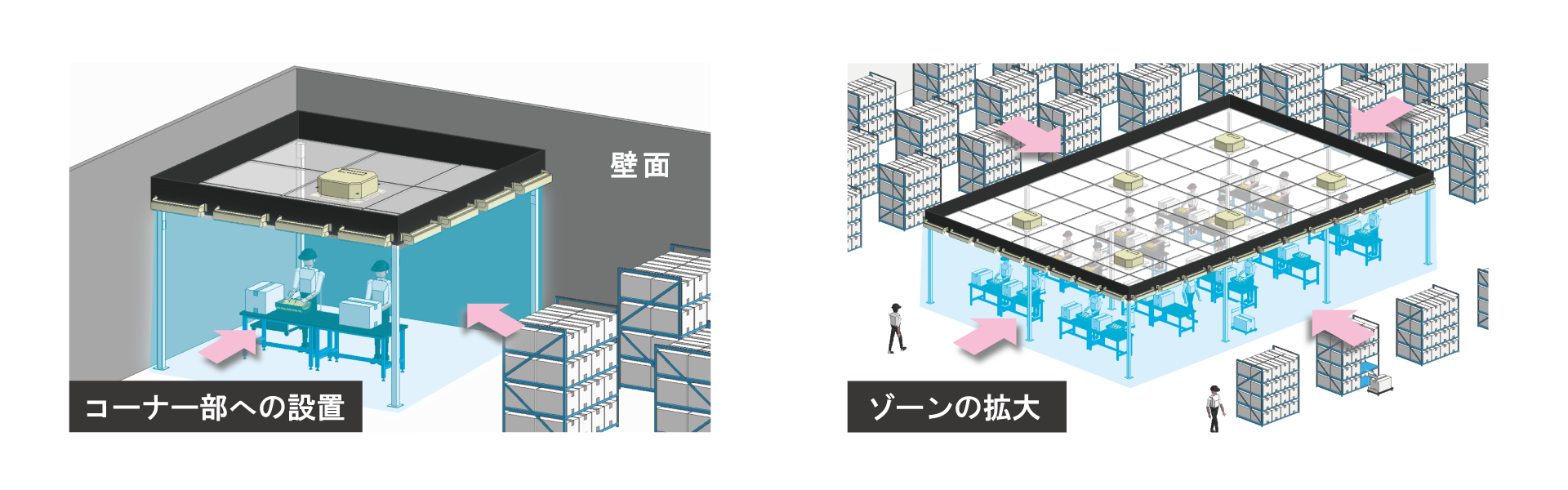エアカーテンによって空調した空気をゾーン内に閉じ込めます。壁がないので、人や物の出入りがスムーズ。また、省スペース性に優れ、柔軟な配置が可能なのでスペースを広く活用できます。