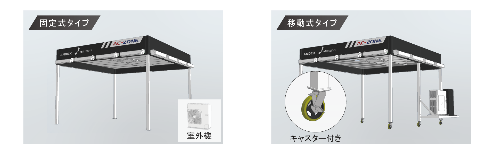 建屋に設置する「固定式」と、キャスターが付いた「移動式」の2タイプをご用意しております。「移動式」は、工場レイアウトの変更にも柔軟に対応できます。