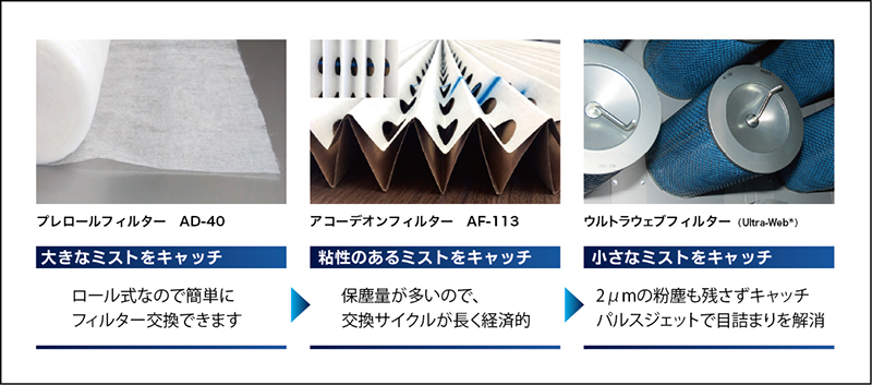 使用する塗料に最適なフィルターを、それぞれの特徴を活かした最高のコンビネーションで使用し、捕集効率99.95%を実現しました。